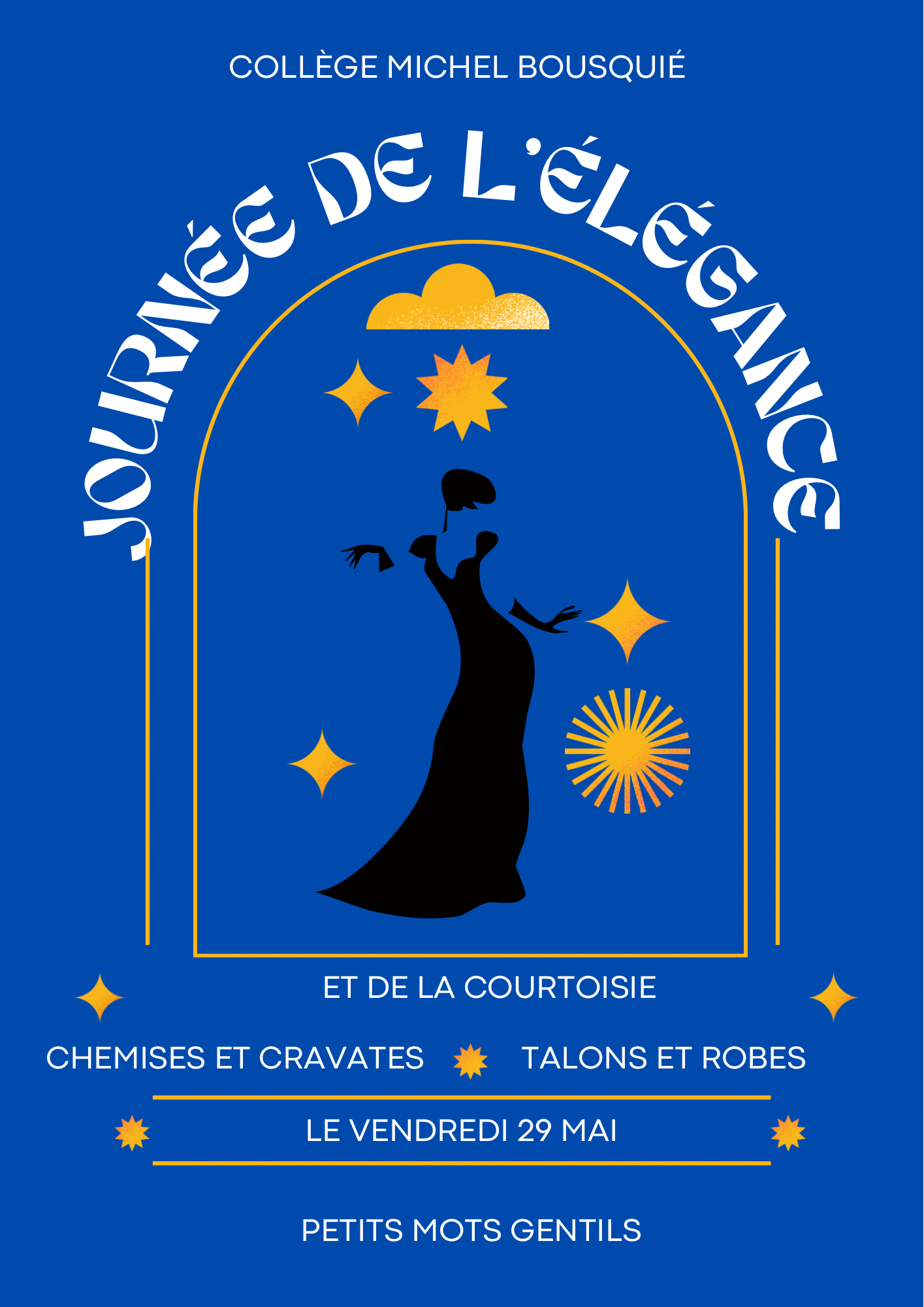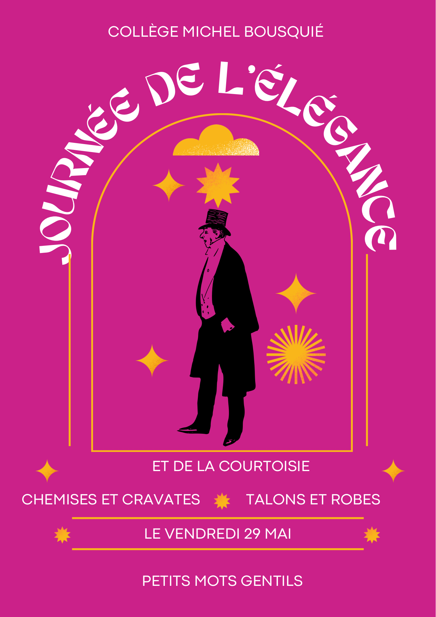 Le 29 mai, le CVC organise une nouvelle édition de la Journée de l'élégance et de la courtoisie ! De 8h25 à 17h00, on oublie et on évite les joggings et on met ses plus beaux habits ! Et on adopte l'élégance qui va avec ! Cette journée est aussi l'occasion d'écrire des mots courtois et sympathiques à toutes celles et tous ceux que vous souhaitez remercier pour leur présence !