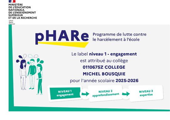 Vous retrouverez ci-dessous le certificat de labellisation du collège Michel Bousquié ainsi que le plan de prévention du collège en matière de lutte contre le harcèlement.